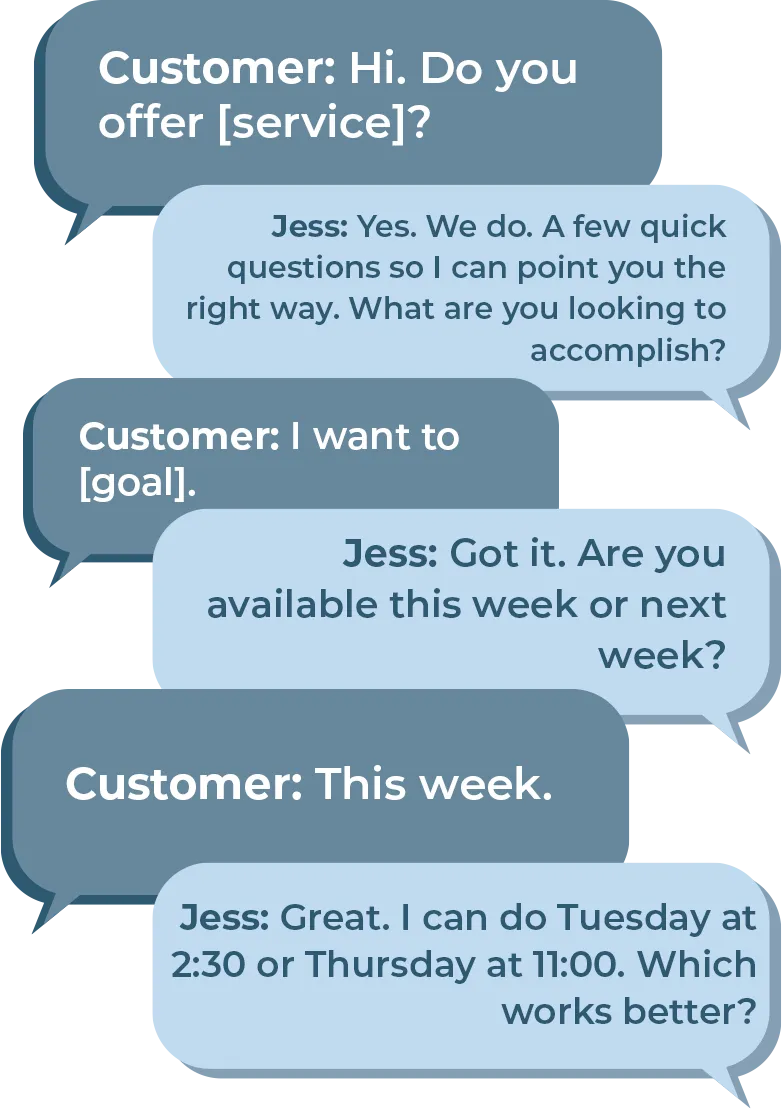 Jess asks the right questions to understand what the lead needs, filters out low-fit inquiries, and captures the details your team needs to take over smoothly.